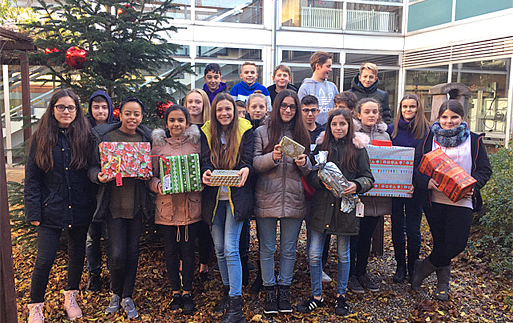 Die Kinder der Klasse 7b der Realschule im Gustav-Heinemann-Schulzentrum in Dinslaken haben für 6 Kinder aus dem Kreis Wesel Weihnachtsgeschenke gekauft. Die entsprechenden Wunschzettel besorgten sich die Schüler vom Wunsch-Baum des Buchladens in Voerde Friedrichsfeld. Um diese Wünsche auch erfüllen zu können, traf man sich nachmittags, bastelte Weihnachtsmänner und Windlichter, die am Tag der offenen Tür in der Schule verkauft wurden.