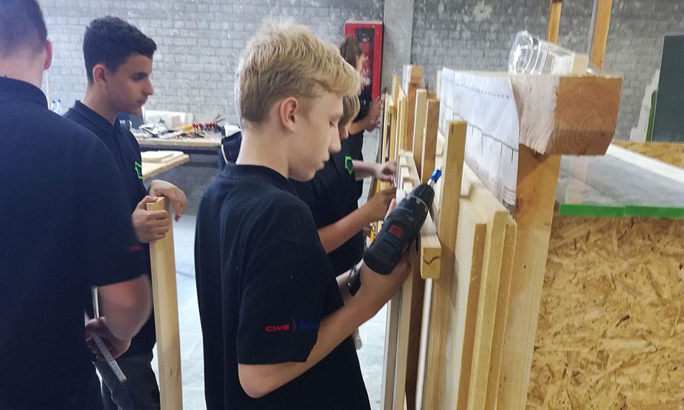 Die Schülerinnen und Schüler des Technikkurses hatten an drei Tagen die Gelegenheit, im Bildungszentrum des Bauhandwerks (BZB) in Wesel sich selber als Handwerker auszuprobieren. Im Mittelpunkt der Projektarbeit zu den Modulen „Aufbau und Dämmung einer Außenwand“ stand die Verwendung von nachhaltigen Materialien. Die Teilnehmerinnen und Teilnehmer machten sich Gedanken zu klima- und ressourcenschondenem Handeln im Bereich „Bauen“. Sie berieten zusammen mit den Projektleitern über die Materialien und die auszuführenden Arbeiten beim Aufbau von Hauswänden. Es wurden Dämmstoffe, Spanplatten, eine Dampfsperre sowie eine Deckelschalung angebracht. An einem Tag wurde das Mauern einer Wand aus Kalksandsteinen unter Anleitung eines Maurermeisters geübt. Diese Aufgabe stellte mit dem Anspruch „dreidimensional gerade“ zu sein eine Herausforderung dar. Die Schülerinnen und Schüler hatten großen Respekt vor der Leistung der Maurer.