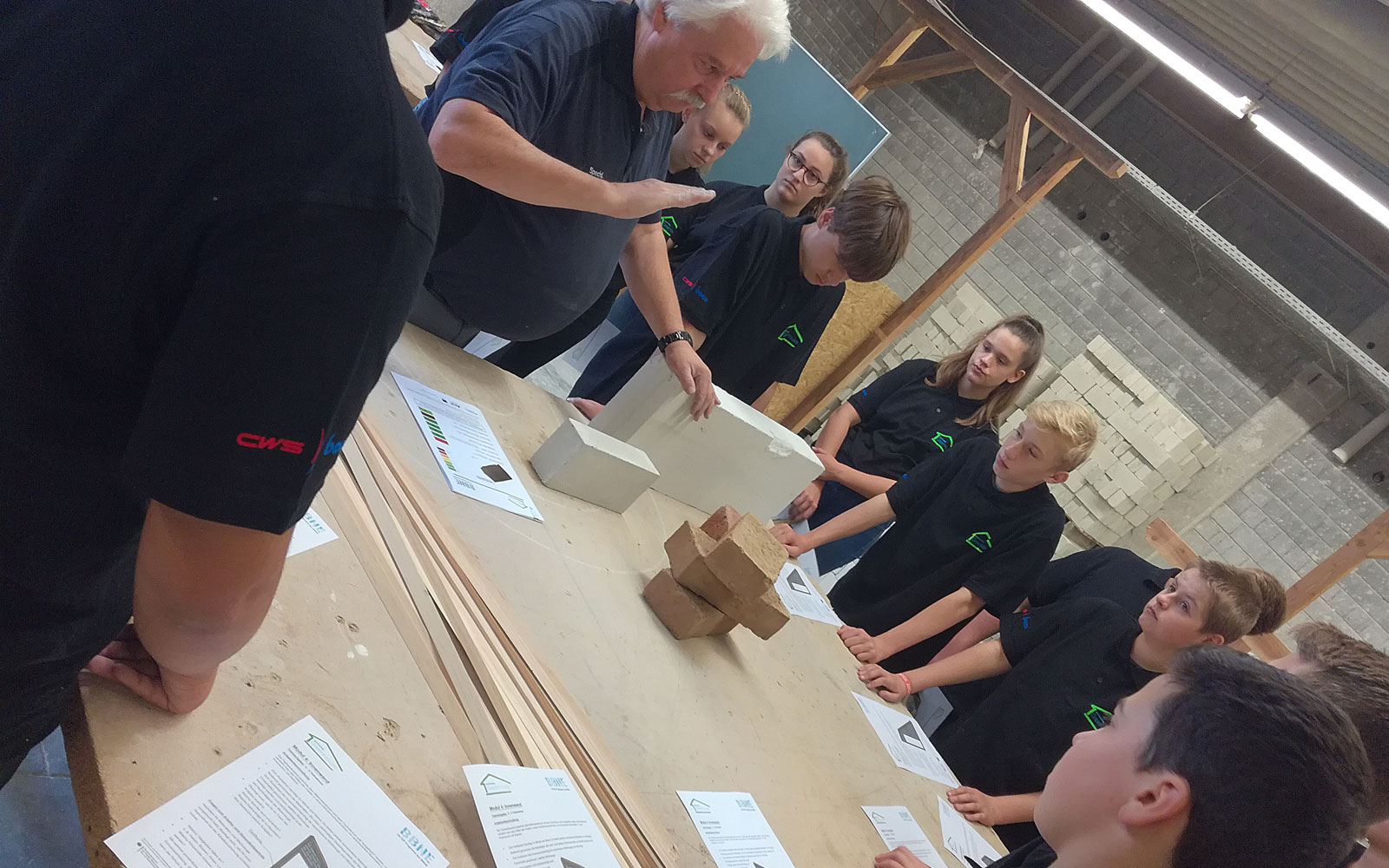 Die Schülerinnen und Schüler des Technikkurses hatten an drei Tagen die Gelegenheit, im Bildungszentrum des Bauhandwerks (BZB) in Wesel sich selber als Handwerker auszuprobieren. Im Mittelpunkt der Projektarbeit zu den Modulen „Aufbau und Dämmung einer Außenwand“ stand die Verwendung von nachhaltigen Materialien. Die Teilnehmerinnen und Teilnehmer machten sich Gedanken zu klima- und ressourcenschondenem Handeln im Bereich „Bauen“. Sie berieten zusammen mit den Projektleitern über die Materialien und die auszuführenden Arbeiten beim Aufbau von Hauswänden. Es wurden Dämmstoffe, Spanplatten, eine Dampfsperre sowie eine Deckelschalung angebracht. An einem Tag wurde das Mauern einer Wand aus Kalksandsteinen unter Anleitung eines Maurermeisters geübt. Diese Aufgabe stellte mit dem Anspruch „dreidimensional gerade“ zu sein eine Herausforderung dar. Die Schülerinnen und Schüler hatten großen Respekt vor der Leistung der Maurer.
